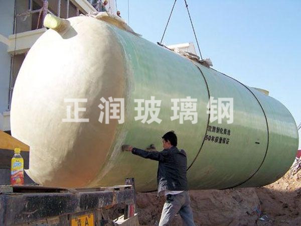 玻璃钢化粪池使用高分子材料与高强度玻璃钢纤维复合制成的圆筒型整体化粪池,与传统砖混化粪池相比,具有严密性好不渗漏、质量轻易于运输、抗压强度高、耐酸碱使用寿命长、安装快捷等优点。圆筒形化粪池有效利用体积大,筒体中及两端有T字型加强筋,两端外用车轮型封头,凹凸面设计。这种结构可以提高池体的强度及水压强度。池体上部设有进出水和清污孔,池内用膜隔仓分成一二级沉淀池和处理池三部分。隔舱板上设置有填充污水处理填料的填料箱,填料为具有弹性的维纶丝束。生活污水从化粪池上部进水口进入池体中1级沉淀池,比重大的部分沉入池底进行化粪处理,比重小的部分漂浮于水面上层,可从清污孔捞出,上层污水经隔舱板上安装的填料箱侧面污水通道环流进入填料箱,与其悬挂式水处理填料富集的微生物接触,使水中的有机物降解。由于改直流泛水为环流泛水化粪原理,污水在池体中增长了滞留时间,污水与填料的接触降解时间更长,有机物降解程度更高,从而使排出的污水中BOD指标大大降低。