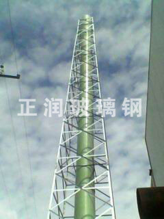 主要用于排放烟气高度为100m-200m的混凝土烟囱的内筒。在此构造中,充分利用了玻璃钢的耐高温、耐腐蚀的特点,混凝土烟囱提供支撑,有的是一个混凝土烟囱套1个玻璃钢内筒,也有的套2个或3个玻璃钢内筒,具体根据业主的设计和要求来定。
